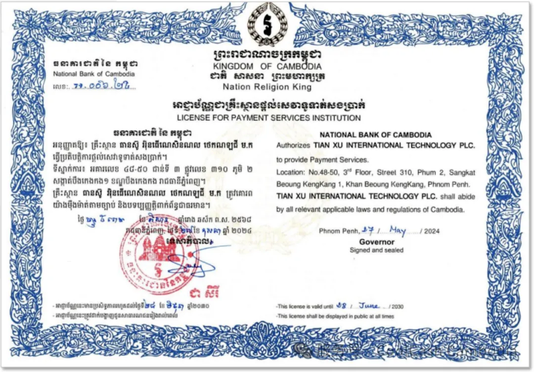 持有柬埔寨国家银行牌照+腾讯支付/支付宝官方合作