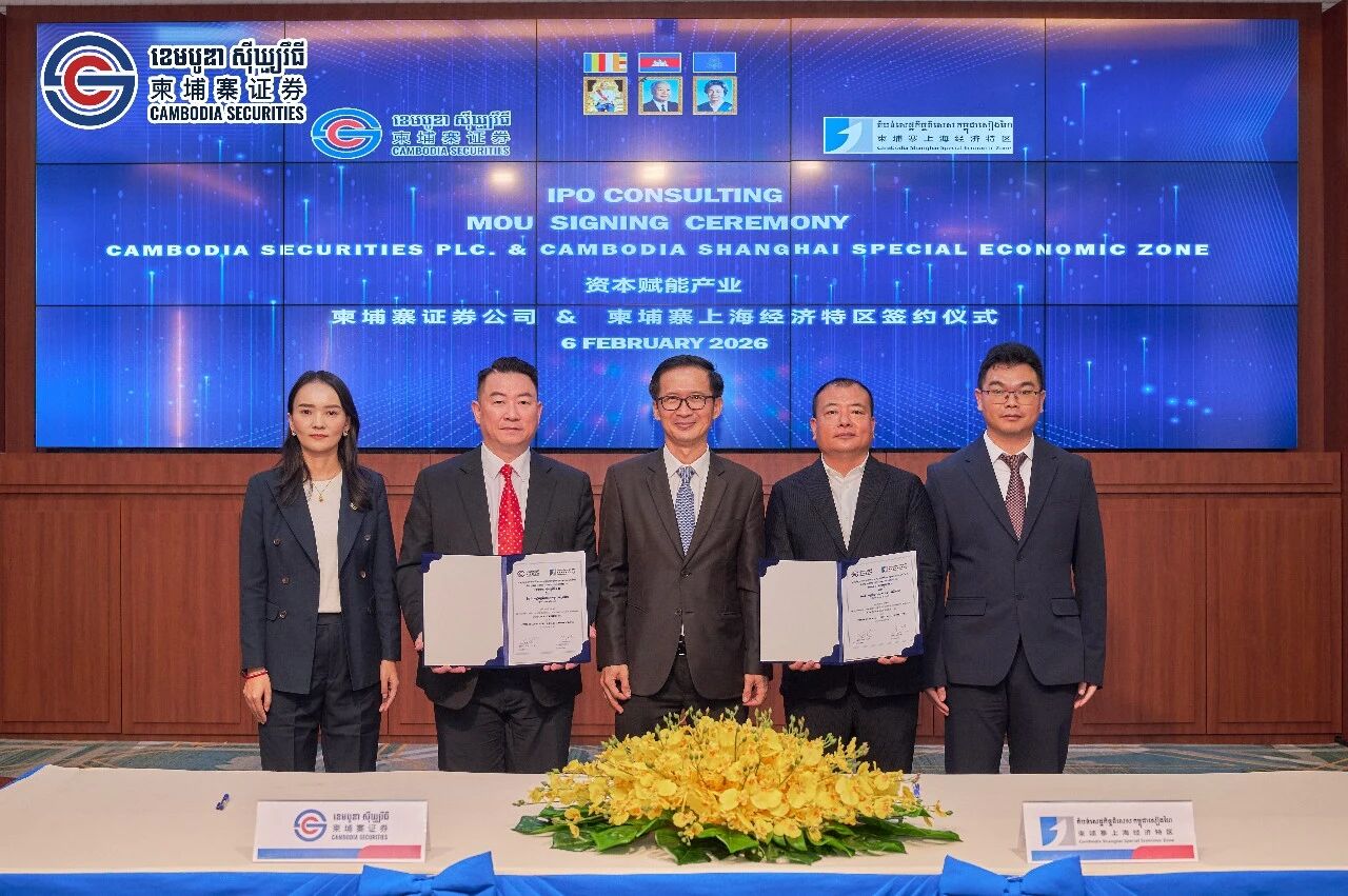 2026年2月6日,柬埔寨证券公司与柬埔寨上海经济特区在柬埔寨证券交易所(Cambodia Securities Exchange,CSX)举行“资本赋能产业——全面战略合作签约仪式”。双方正式签署全面战略合作备忘录(MOU),将围绕资本市场服务、企业上市培育与融资支持等领域开展系统合作,推动经济特区与园区企业规范化、透明化与市场化发展,打造资本市场支持产业集聚与高质量增长的示范平台。