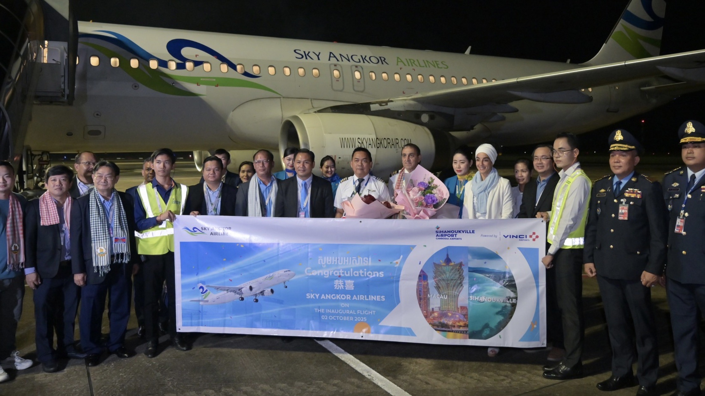柬埔寨天空吴哥航空(Sky Angkor Airlines)首班从中国澳门起飞的航班平稳降落西哈努克城,标志着澳门与西哈努克城之间直飞航线正式开通,柬埔寨在加强区域空中联系方面又迈出重要一步。