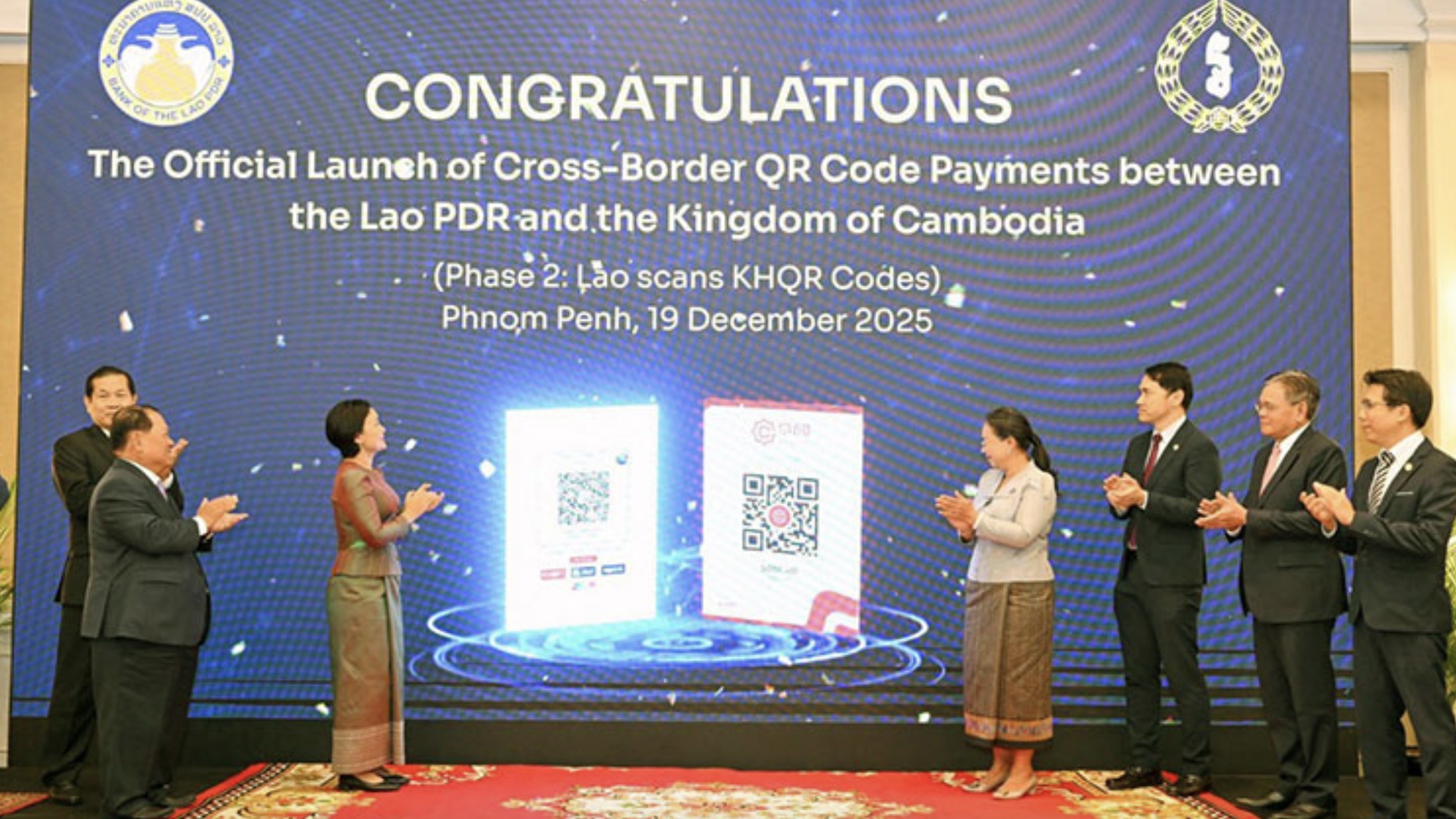 近日,柬埔寨国家银行(NBC)与老挝人民民主共和国银行(BOL)在金边联合举办启动仪式,正式上线跨境二维码支付合作第二阶段。本次活动以“第二阶段:老挝扫描KHQR码”为主题,由柬埔寨国家银行行长谢丝蕾(Chea Serey)与老挝人民民主共和国银行行长Bounkham Vorachit共同主持,标志着两国在金融互联互通与经济一体化进程中迈出关键一步。