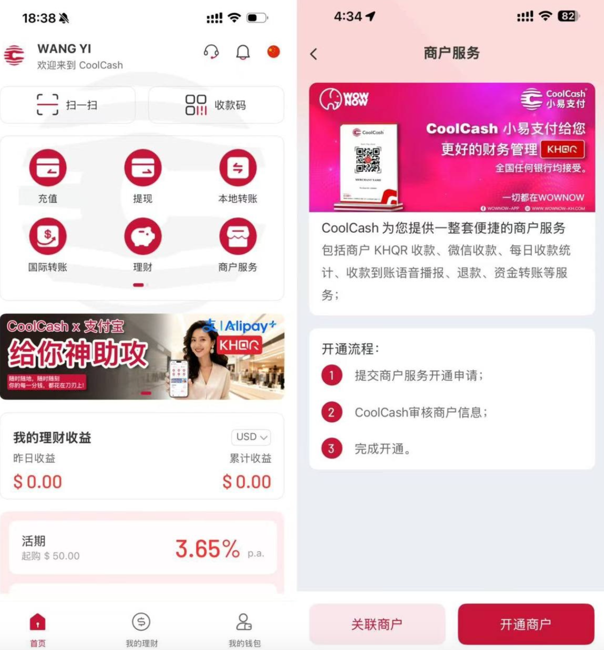跨境支付能力:作为微信支付柬埔寨官方授权平台,CoolCash小易支付支持安全便捷的跨境汇款、支付宝和微信实时转账,目前已覆盖中国、中国香港、泰国、越南、马来西亚、韩国、印尼和菲律宾。