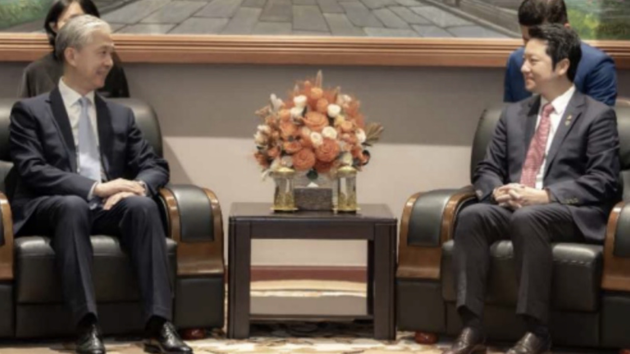 图为2024年8月6日中国驻柬埔寨大使汪文斌到任拜会时任柬埔寨旅游部长宋速肯阁下